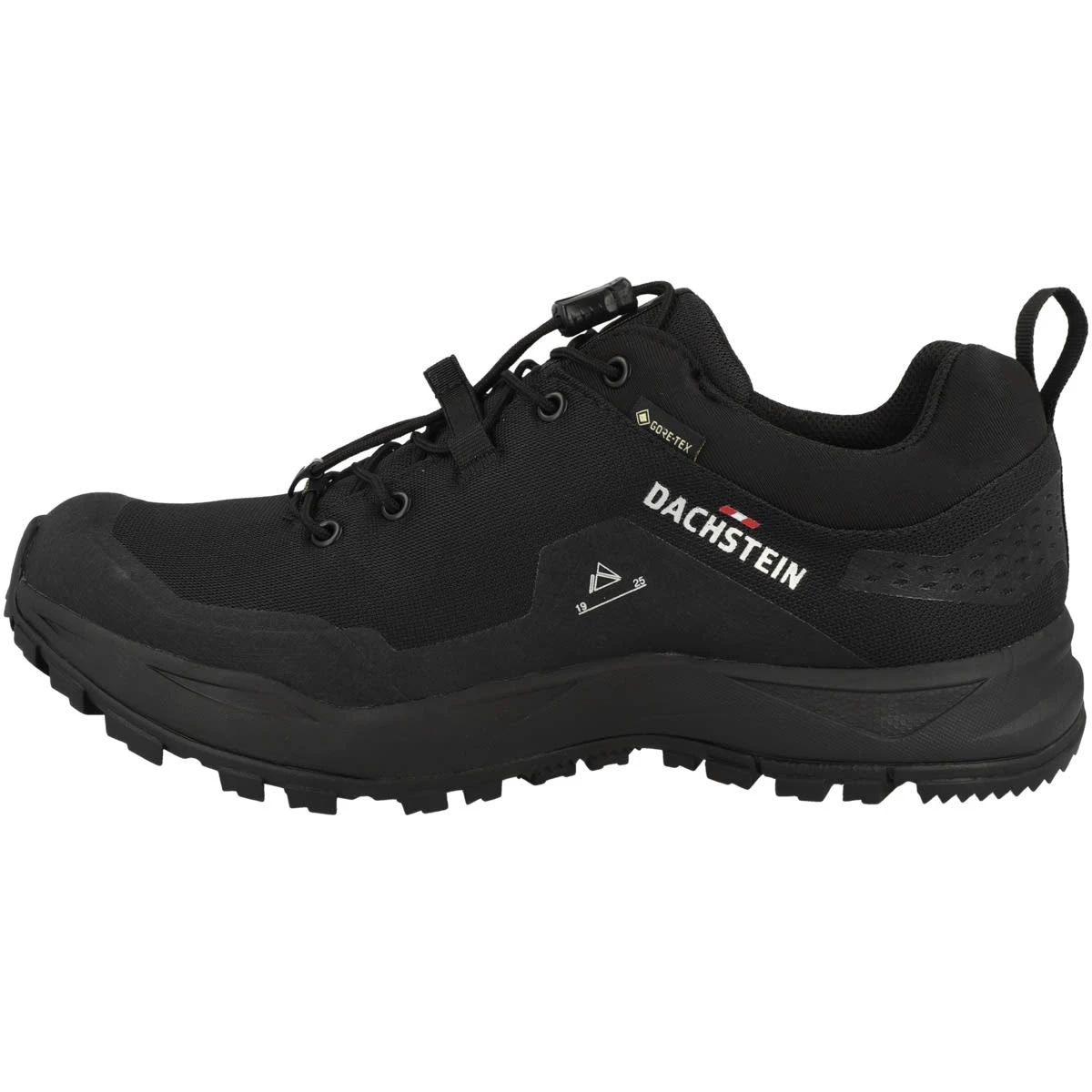Die Schuhe bestehen aus einem robusten Mesh-Obermaterial mit schützenden TPU-Verstärkungen und einer wasserdichten GORE-TEX-Membran. Diese ist für die im Verhältnis sehr großen Wassertropfen von außen undurchlässig, lässt aber Schwitzfeuchtigkeit in Form von Wasserdampf von innen nach außen durch. Sie zeichnen sich durch eine flache Bauweise mit einer Absatzhöhe von 25 mm aus. Dadurch vermitteln die Schuhe ein natürliches Laufgefühl. Die Gummilaufsohle hat griffige, 4 mm tiefe Stollen, die auch auf anspruchsvollem Gelände für guten Halt sorgen. Schnelles An- und Ausziehen bietet der Schnellschnürverschluss, sodass du direkt in dein Outdoor-Erlebnis starten kannst.