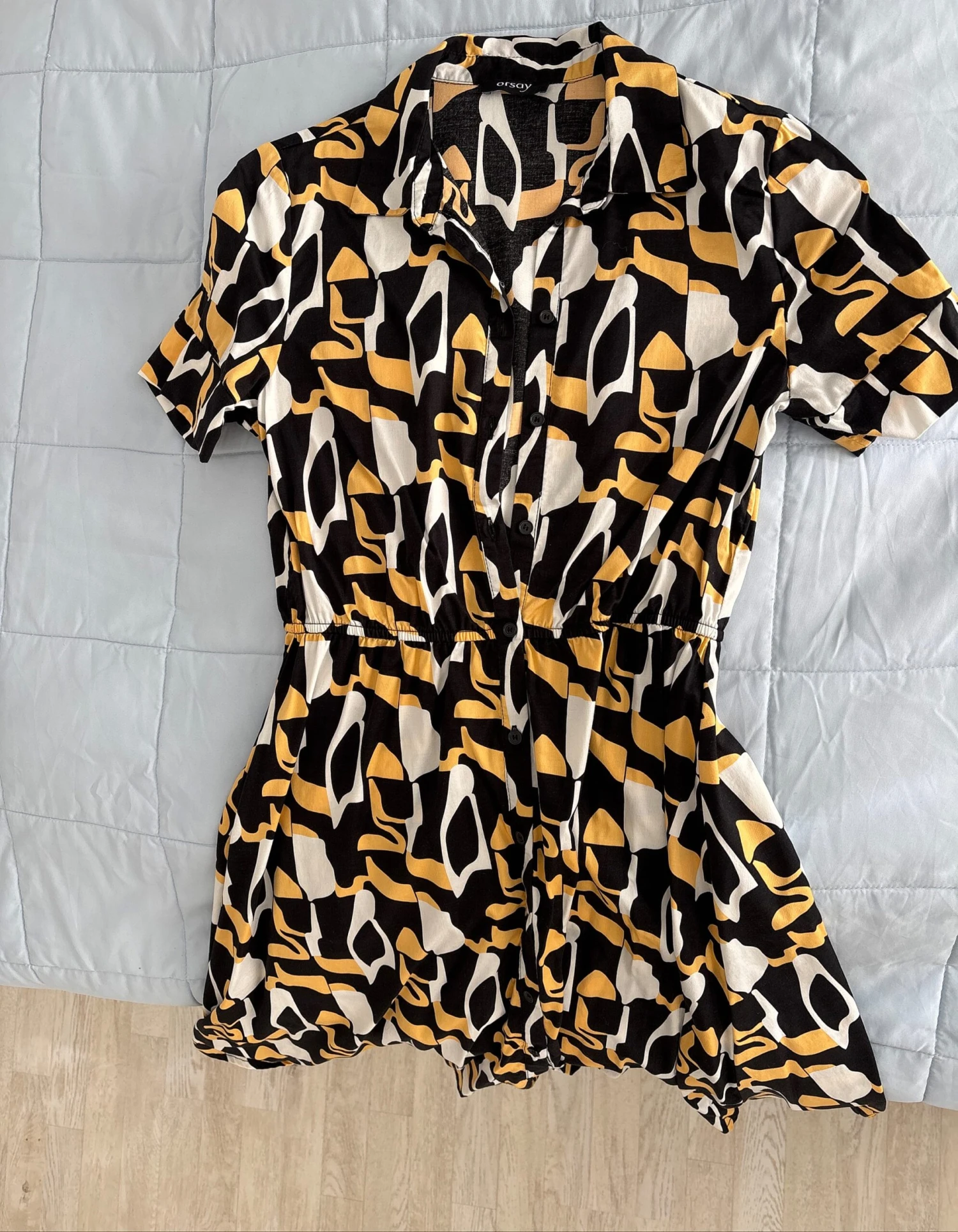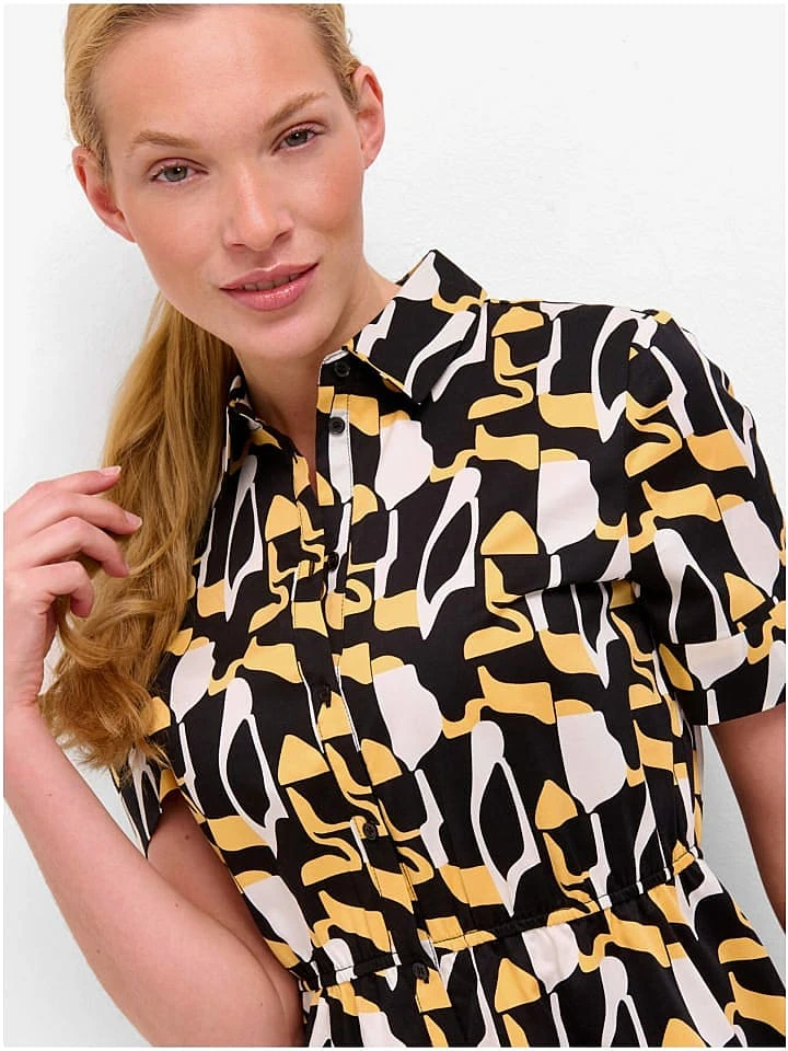 Farbe: schwarz,gelb,weiss. Muster: geometrisch. Schnitt: Hemd, A-Linie. Länge: kurz. Ausschnitt: mit Kragen. Ärmel: kurzarm. Verschluss: Knöpfe. Nachhaltigkeit: BCI (Besser und nachhaltiger Baumwollanbau). Das Model trägt Größe: 36. Modell misst: 174 cm