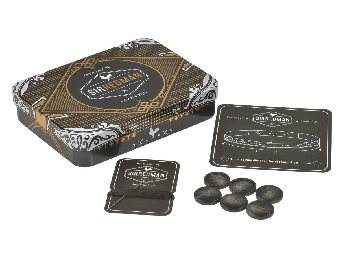 Sir Redman fertigt seine Hosenträger vollständig mit der Hand im eigenen Atelier an. Die Hosenträger sind mit hochwertigen Lederschlaufen und robusten Clips ausgestattet. Sie sind mit Schnallen in der Länge verstellbar. Mit dem speziell mitgelieferten Blechdöschen mit 6 Knöpfen, Nadel und Faden und einem Abstandshalter, um die Knöpfe an Ihrer Hose zu befestigen, ist es sehr einfach, Ihre Hosenträger auf authentische Weise zu tragen. Ist das nichts für Sie? Verwenden Sie dann die hochwertigen Clips, mit denen Sie sie an Ihrem Hosenbund befestigen. Sie sind einzeln abnehmbar. Benutzen Sie die Schlaufen nicht? Dann bewahren Sie sie in dem Blechdöschen auf. Nützlich, nicht wahr?