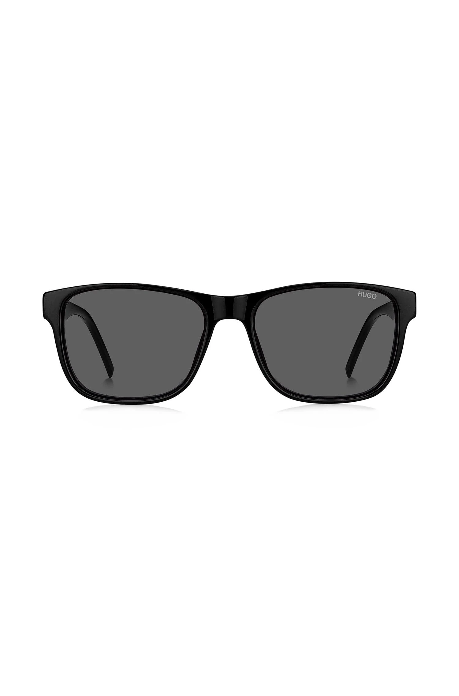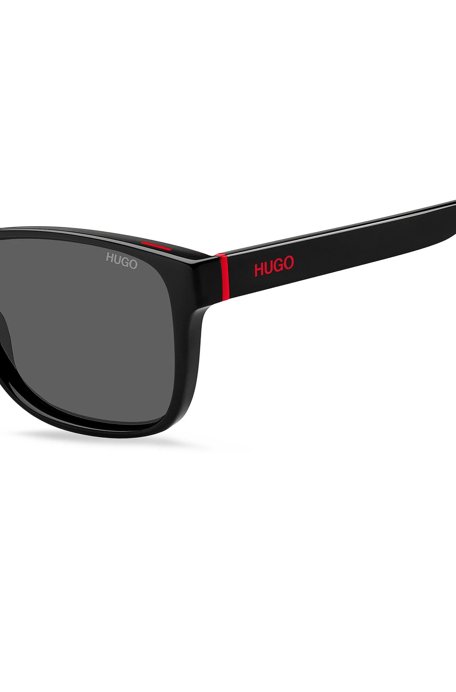 Progressive HUGO Sonnenbrille. Die Herren-Sonnenbrille aus schwarzem Acetat mit getönten Gläsern ist mit Akzenten in HUGO Rot versehen, darunter ein Logo am Bügel. Flex-Scharniere runden das präzise gefertigte Accessoire ab.