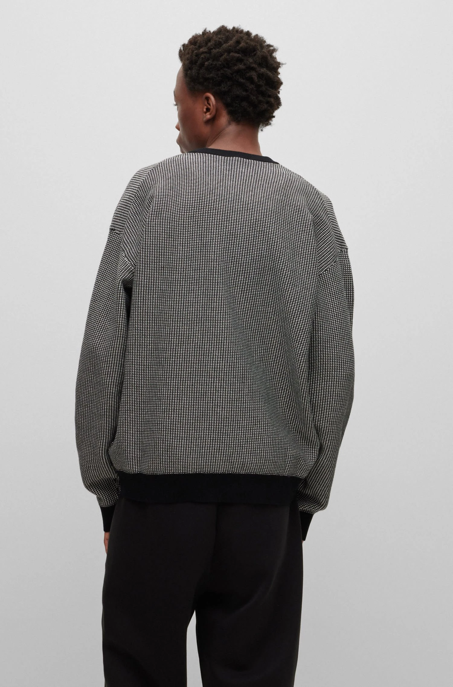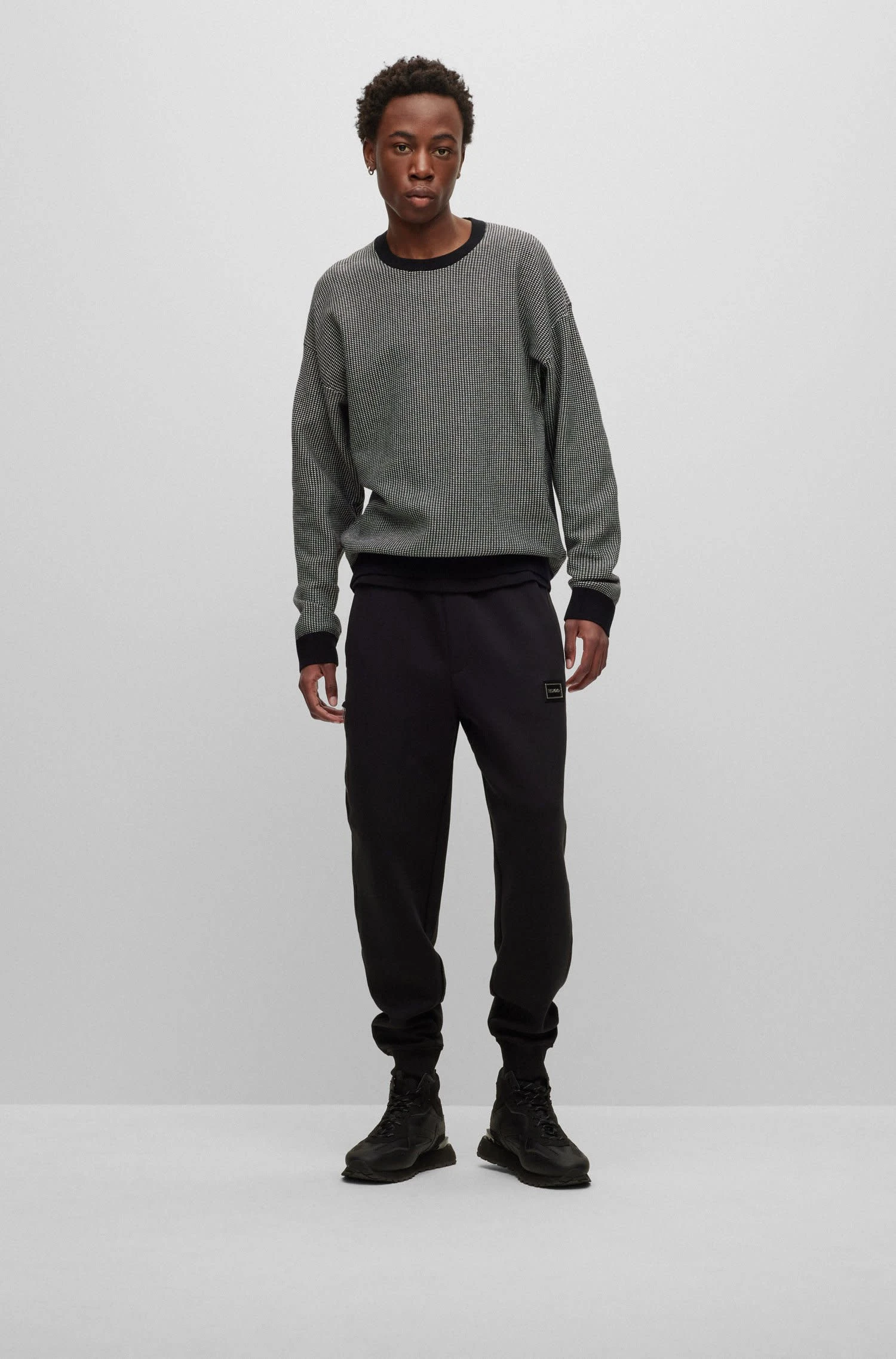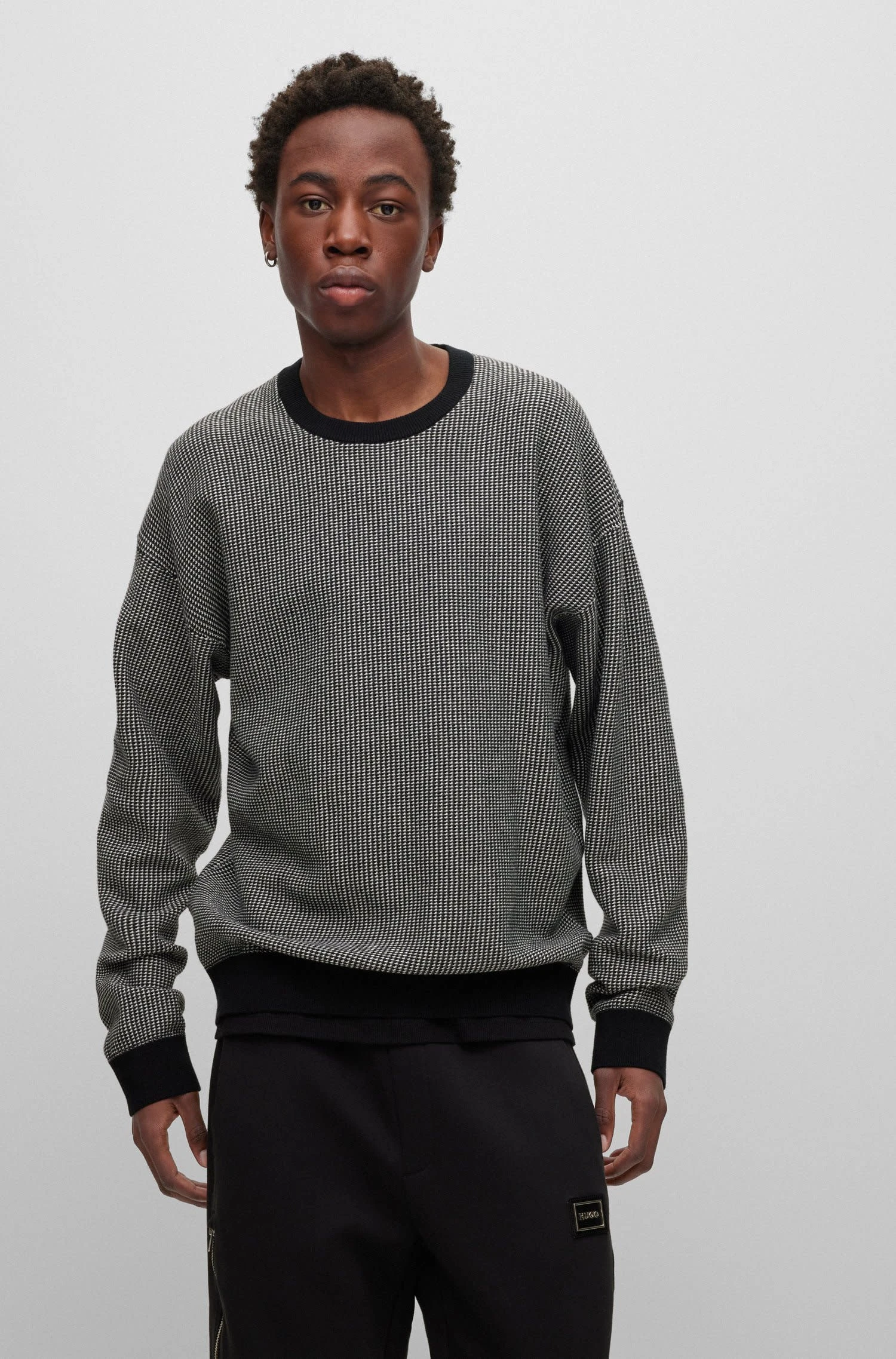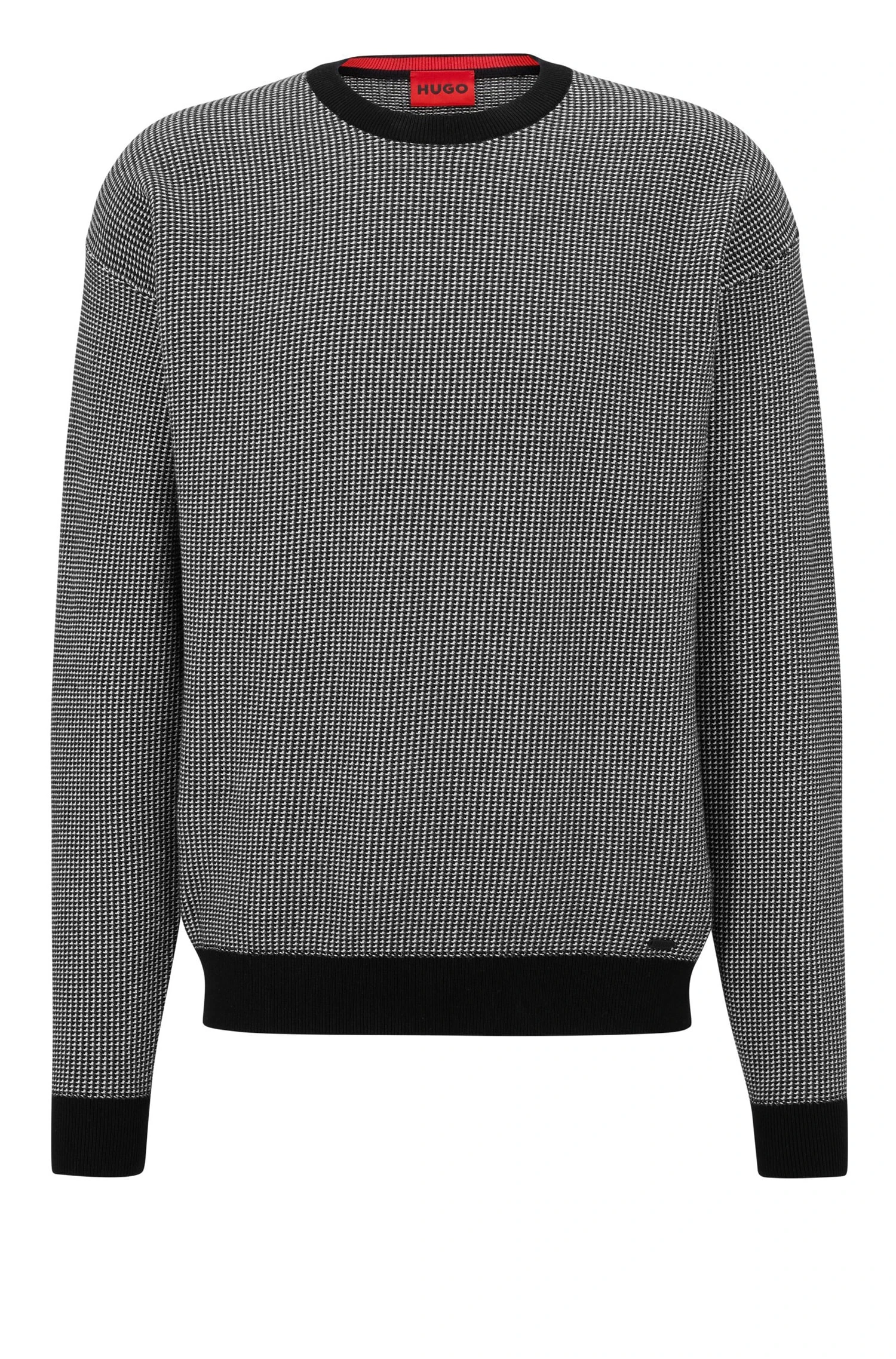 Locker geschnittener HUGO Pullover. Der Herren-Pullover mit Rundhalsausschnitt ist mit einer edlen Jacquard-Struktur gestrickt. Unifarbene Details und ein HUGO Logo-Etikett sorgen für einen charakteristischen Touch. Relaxed Fit / Lockere Passform Rundhalsausschnitt Lange Ärmel Mit schwarzen Rippstrickbündchen Logo-Emblem über dem Bündchen Pflegehinweise: Bleichen Nicht erlaubt, Bügeln geringe Temperatur, Nicht Trockner geeignet, Schonend reinigen mit Perchlorethylen, Sehr schonend waschen bei 30 °C Feinwäsche
