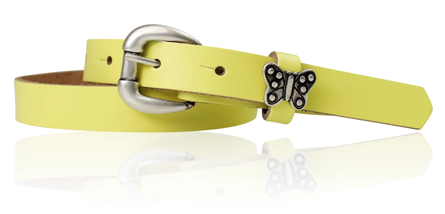 Ein süßer Schmetterling-Kindergürtel den die Kleinen lieben werden. Auf die Gürtelschlaufe ist ein süßer Schmetterling aufgenietet. Die 7-fache Lochung sorgt für eine längere Tragezeit weil Sie den Gürtel gut verstellen können. Auch die kleine, modische Dornschnalle macht viel her. Der Riemen ist aus echtem Leder, EXTRA dünn geschnitten: trägt nicht auf, ist leicht, reißt nicht und ist plastikfrei! Made in Germany.