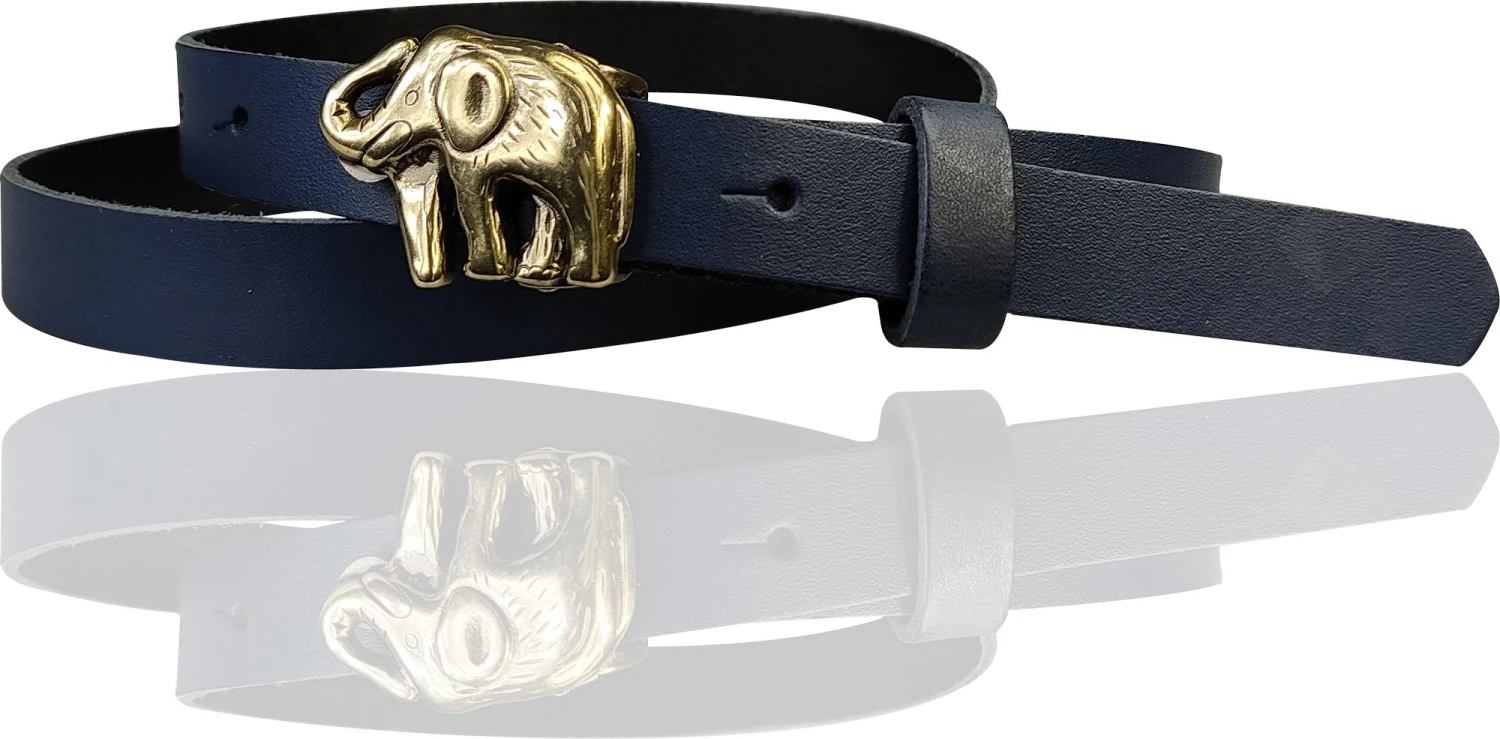 Edler Kindergürtel mit einer messingfarbenen Elefanten-Gürtelschnalle. Der schmale Gürtelriemen ist aus echtem Rindsleder und in vielen Farben erhältlich. Gürtelbreite: 2 cm