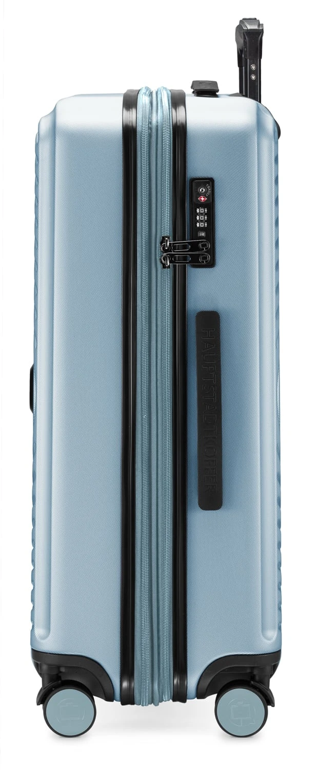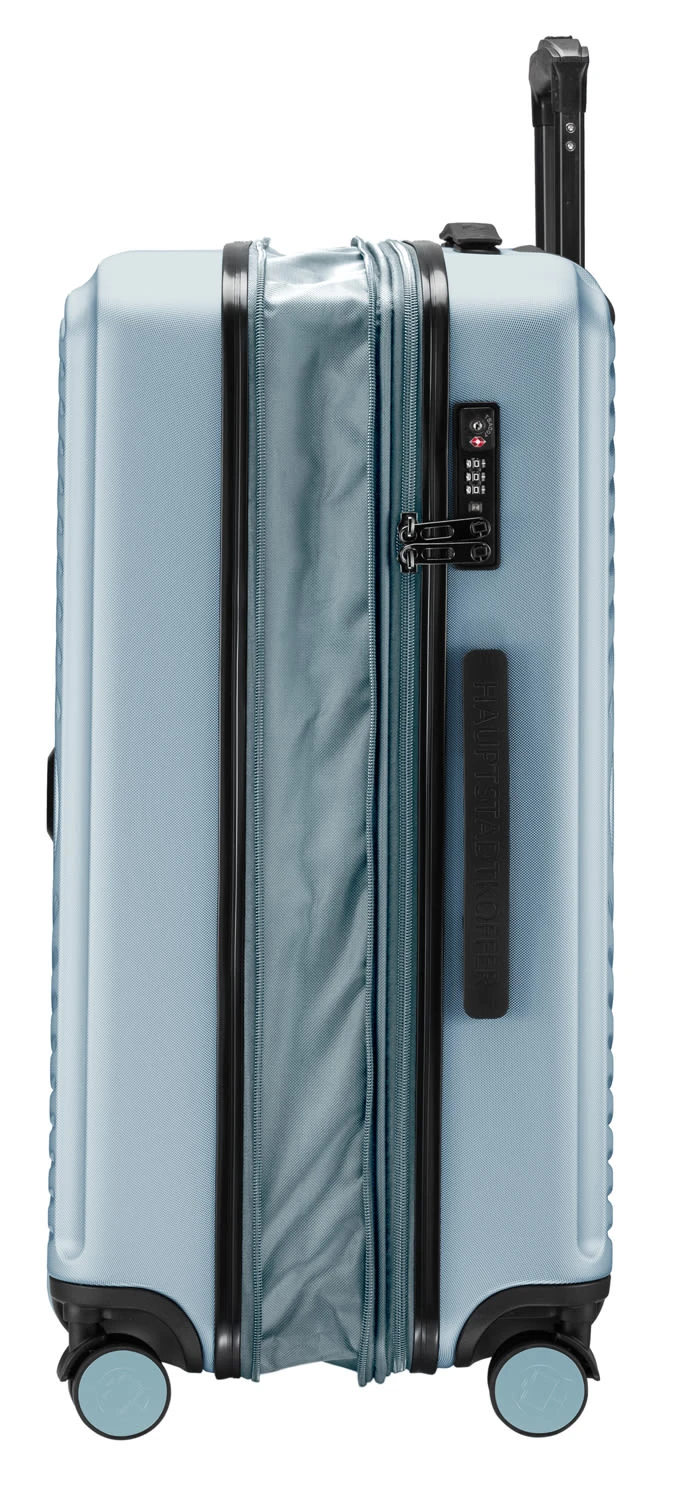 Ein trendiger Begleiter bei Fern- und Nahreisen ist der unifarbene Trolley »Mitte« mit TSA Schloss der Marke HAUPTSTADTKOFFER. Mit seiner ansprechenden Optik in Form und Farbe wird er zum Blickfang auf Reisen. Der Koffer ist mit leichtgängigen Doppelrollen und einer verstellbaren Teleskopstange ausgestattet. Bei geringstem Kraftaufwand lässt er sich auch in bepacktem Zustand aufrecht schieben oder ziehen. Das Innenleben stellt viel Platz für Bekleidung und mehr zur Verfügung. Bei Bedarf kann das Volumen durch die integrierte Dehnfalte vergrößert werden. Das Hauptfach ist voll gefüttert und durch zwei Raumteiler mit Reißverschluss praktisch unterteilt.