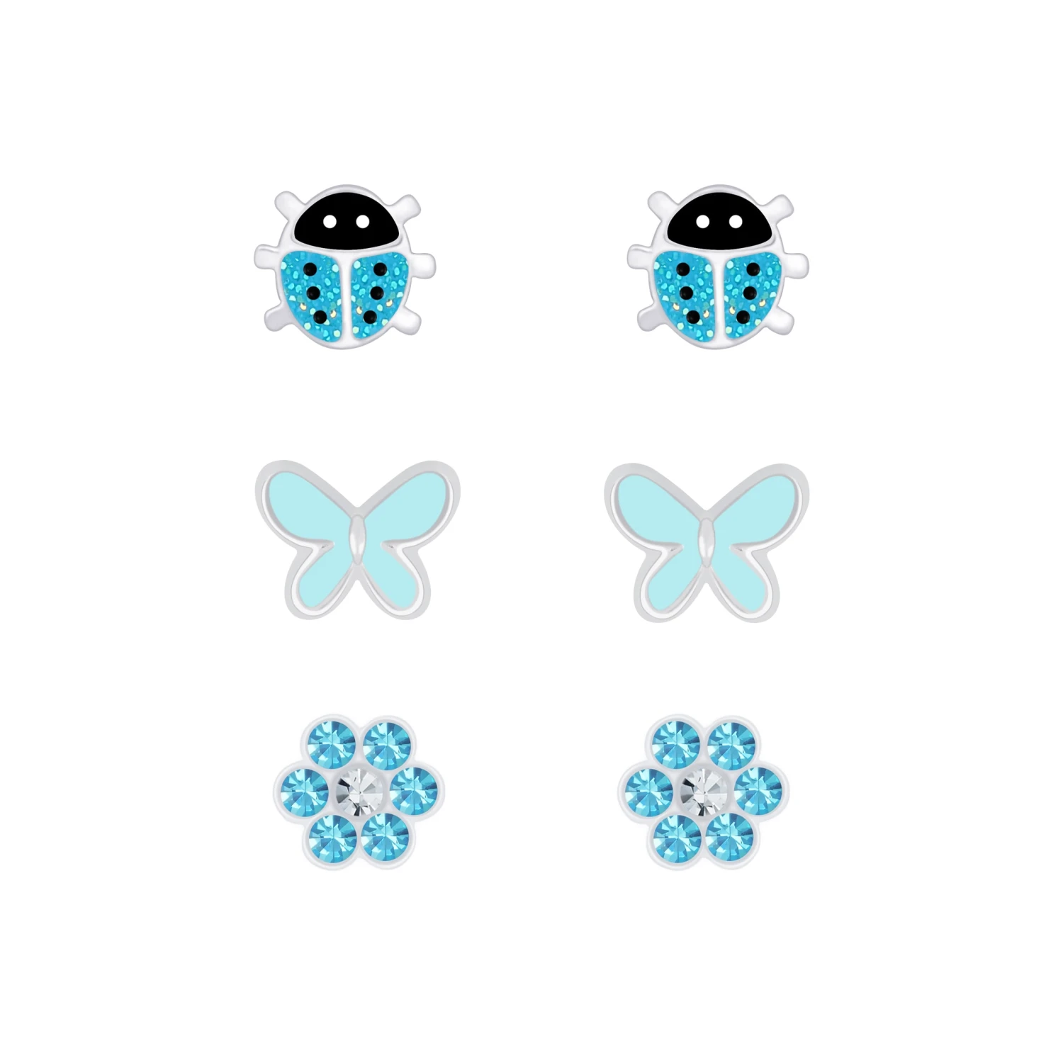 Artikel: 1) Ohrstecker-Set bestehend aus Marienkäfer (7 x 6 mm), Schmetterling (6 x 5 mm), Blume (6 mm)